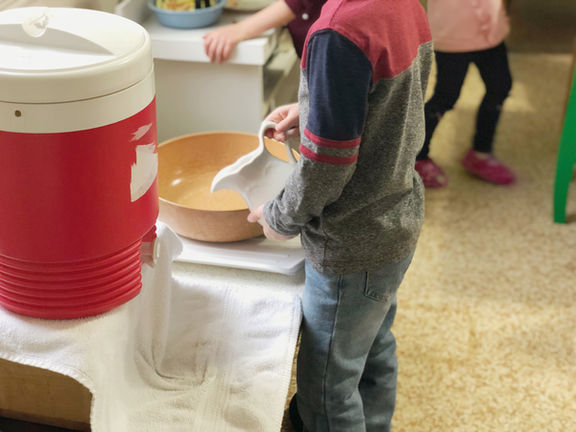 The school day typically begins with individual instruction and independent work. The students frequently work in small groups, or with a teacher who presents lessons according to child-readiness. Mid-morning, the children gather for snack time. They serve themselves and clean up after themselves. Grace, courtesy, and table manners are modeled and encouraged by the teachers. Parents take turns preparing a healthy snack each day for the entire class.